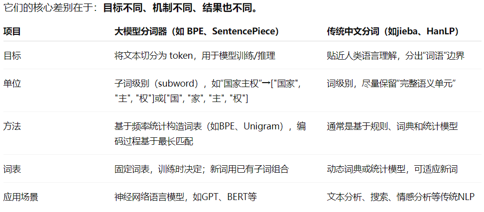 大模型的分词是为了满足模型输入 token 的形式,而传统中文分词是为了符合人类语义理解习惯。