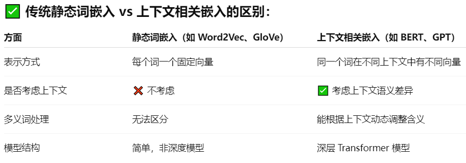 Q6:传统的静态词嵌入(如 word2vec)与大模型产生的上下文相关的嵌入相比,有什么区别?有了 与上下文相关的嵌入,静态词嵌入还有什么价值?