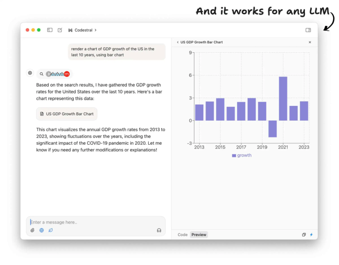 功能:支持任意LLM模型(如GPT-4、Claude、Gemini等),具备多模态聊天(音频、PDF、图片、文本等)、网页搜索(Tavily API或本地浏览器)、MCP工具集成(如Notion、Google Sheets等)以及实时渲染HTML/React/图表等功能。