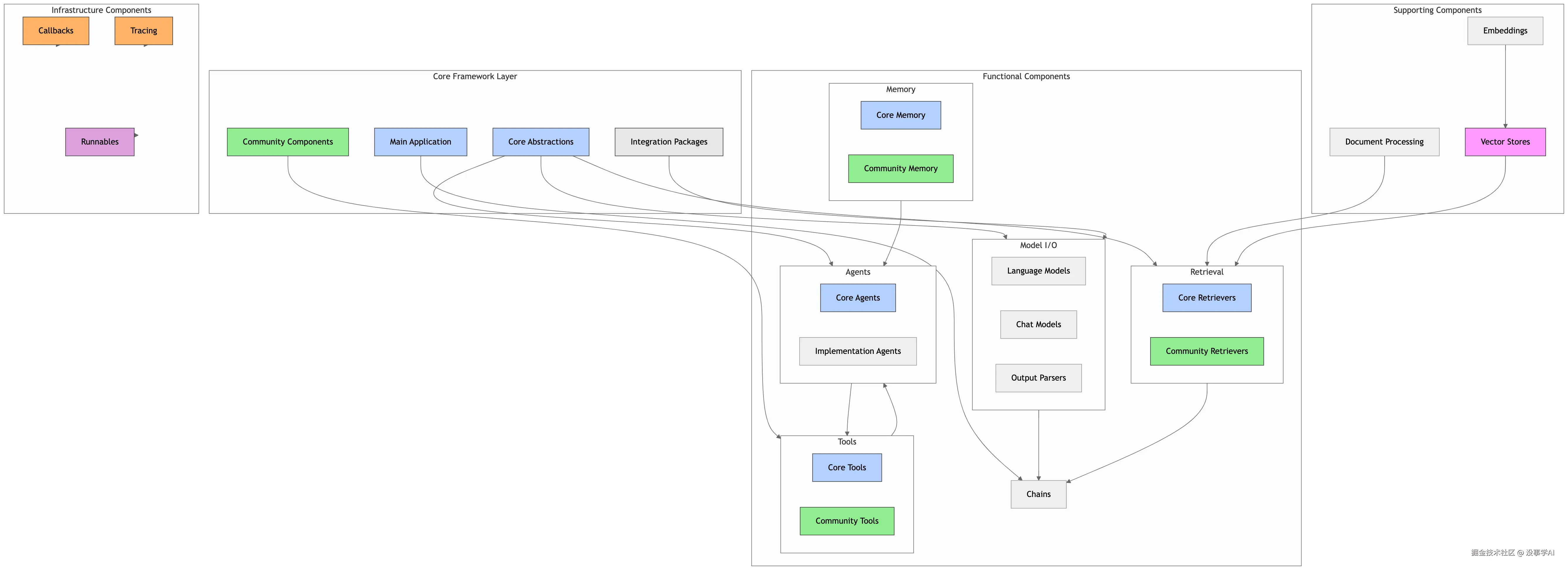 想象 LangChain 的架构图是一座智能城市的布局图,每个模块都是城市里不同功能的区域,它们相互协作,让这座 “智能城市” 高效运转。从用户输入信息开始,信息就像城市中的 “访客”,在各个区域(模块)中穿梭,经过一系列处理,最终输出用户需要的结果。