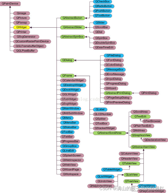 QWidget类时所有组件和窗口的基类。内部包含了一些最基础的界面特性。