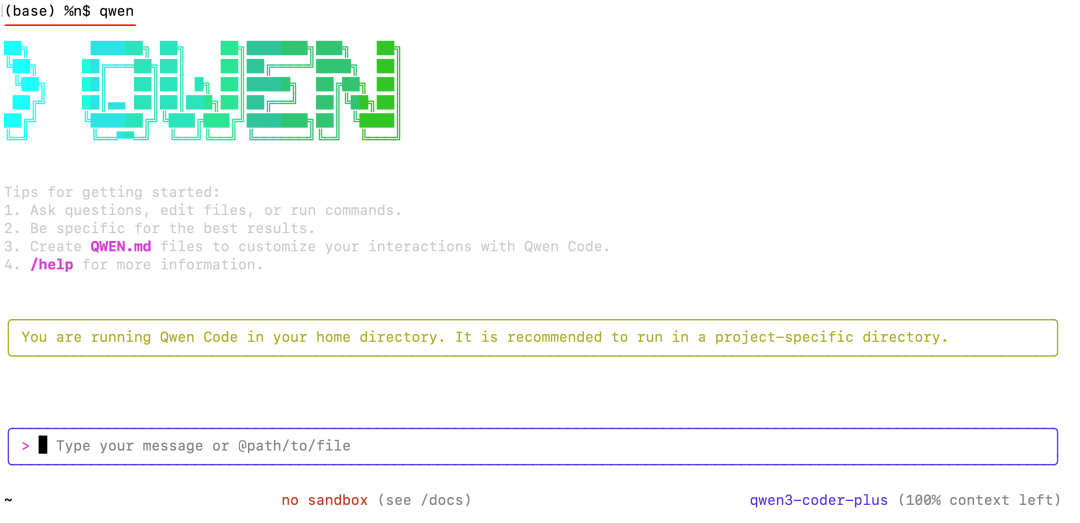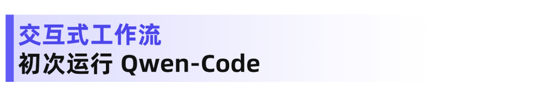 在任意目录下,在终端中输入 Qwen 命令即可启动一个交互式会话。您会看到一个qwen > 的提示运行显示,以及下方的输入框,这里就是您与编码代理进行自然语言交流的入口。