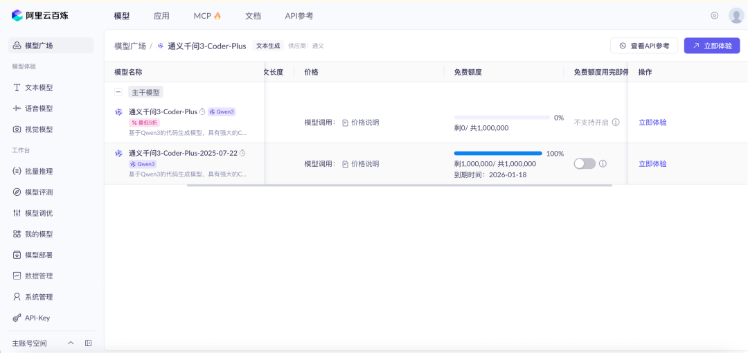 根据您所在的地理位置,访问相应的平台(阿里云百炼或Model Studio),按照页面提示查看 Qwen-Coder 模型,并且可以发现当前账户下的模型会有一定的免费调用额度。