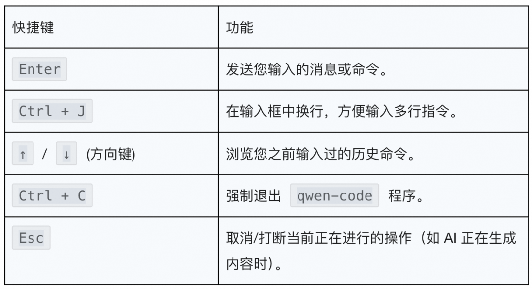 3. 键盘快捷键:使用以下的快捷键可以让你更好的操作Qwen-Code的功能。