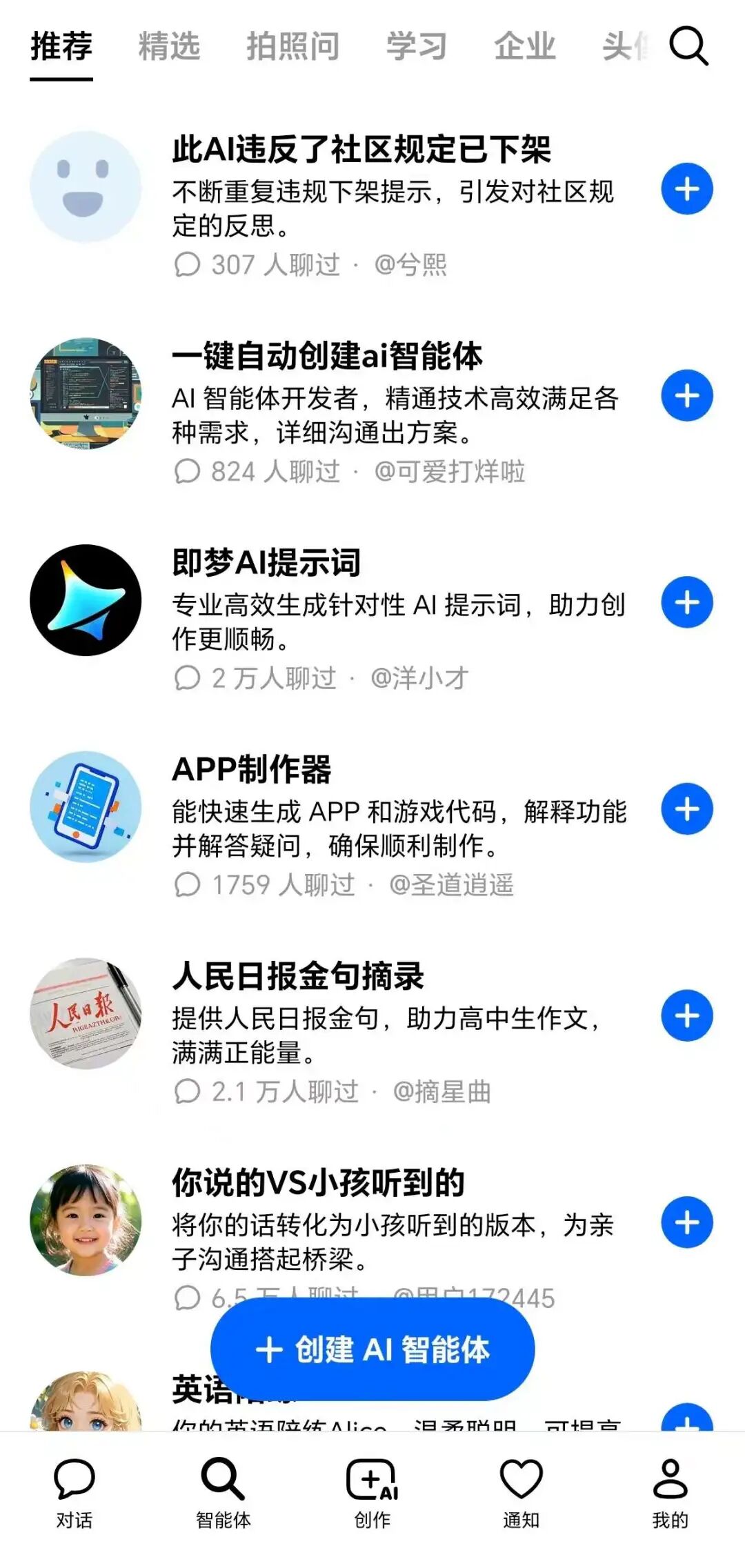 这类平台允许用户通过手机应用,只需简单输入一句话描述,做一些简单配置,就能快速生成智能体,真正实现了移动端便捷开发和应用。