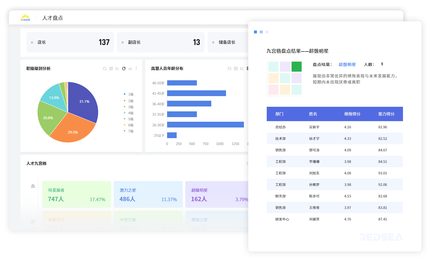 - 人才盘点与继任:为企业提供店长、营运经理等关键管理岗位的胜任力模型,帮助企业敏捷建模,明确人才标准。人才盘点中心完整记录核心人才的简历、管理历练、绩效、证照等数据,并通过内置人才九宫格分析模型,直观呈现人才分布、后备状态和胜任力,从组织、门店、个人三个层面自动生成盘点报告。