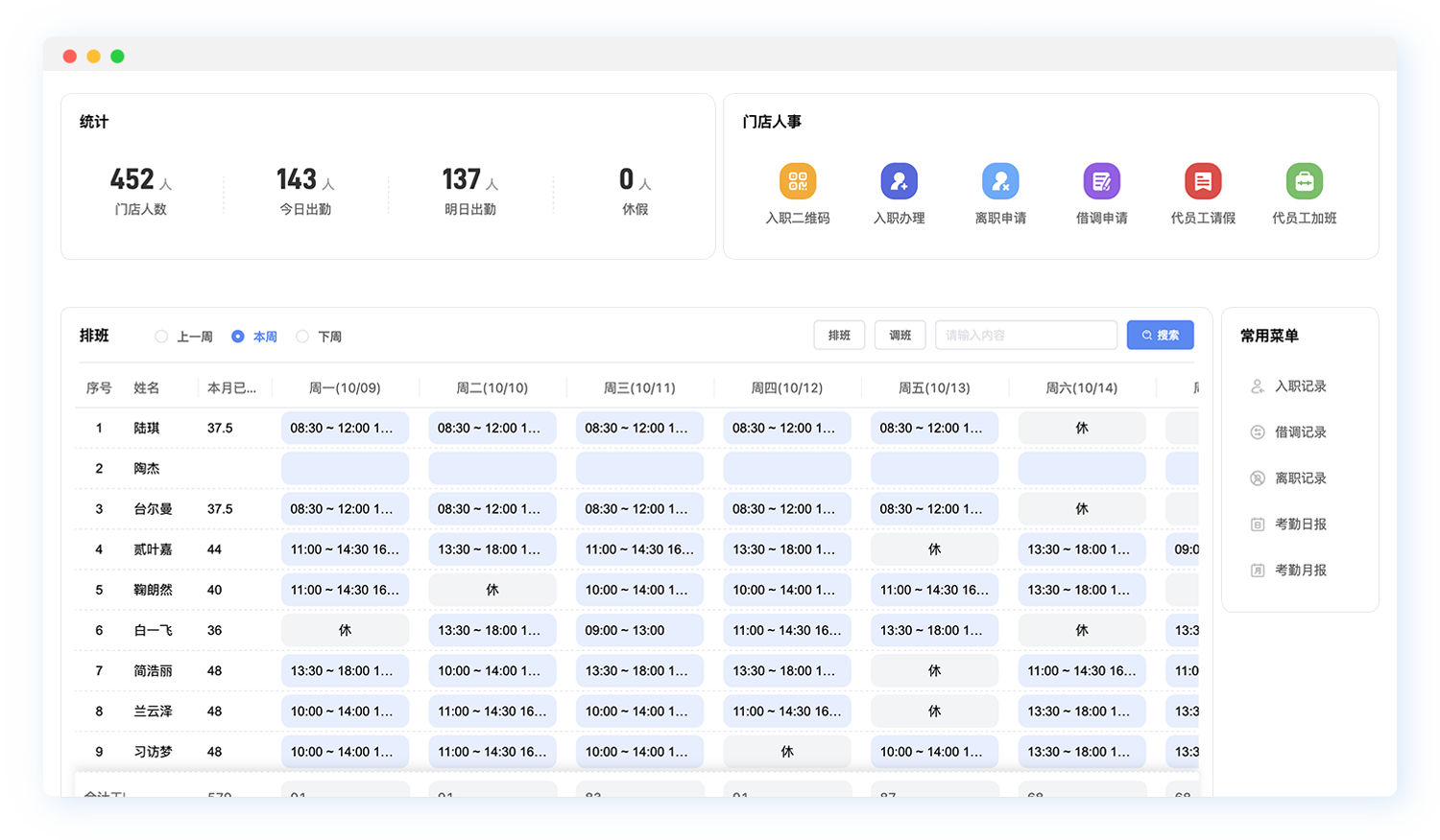 - 店长工作台:为门店店长提供移动端专属工作台,支持档案维护、考勤审批、灵活排班、招聘裂变、试工管理及数据填报等功能。店长可随时随地处理门店人事事务,将精力更多地投入到业务运营中,实现管理效能的最大化。