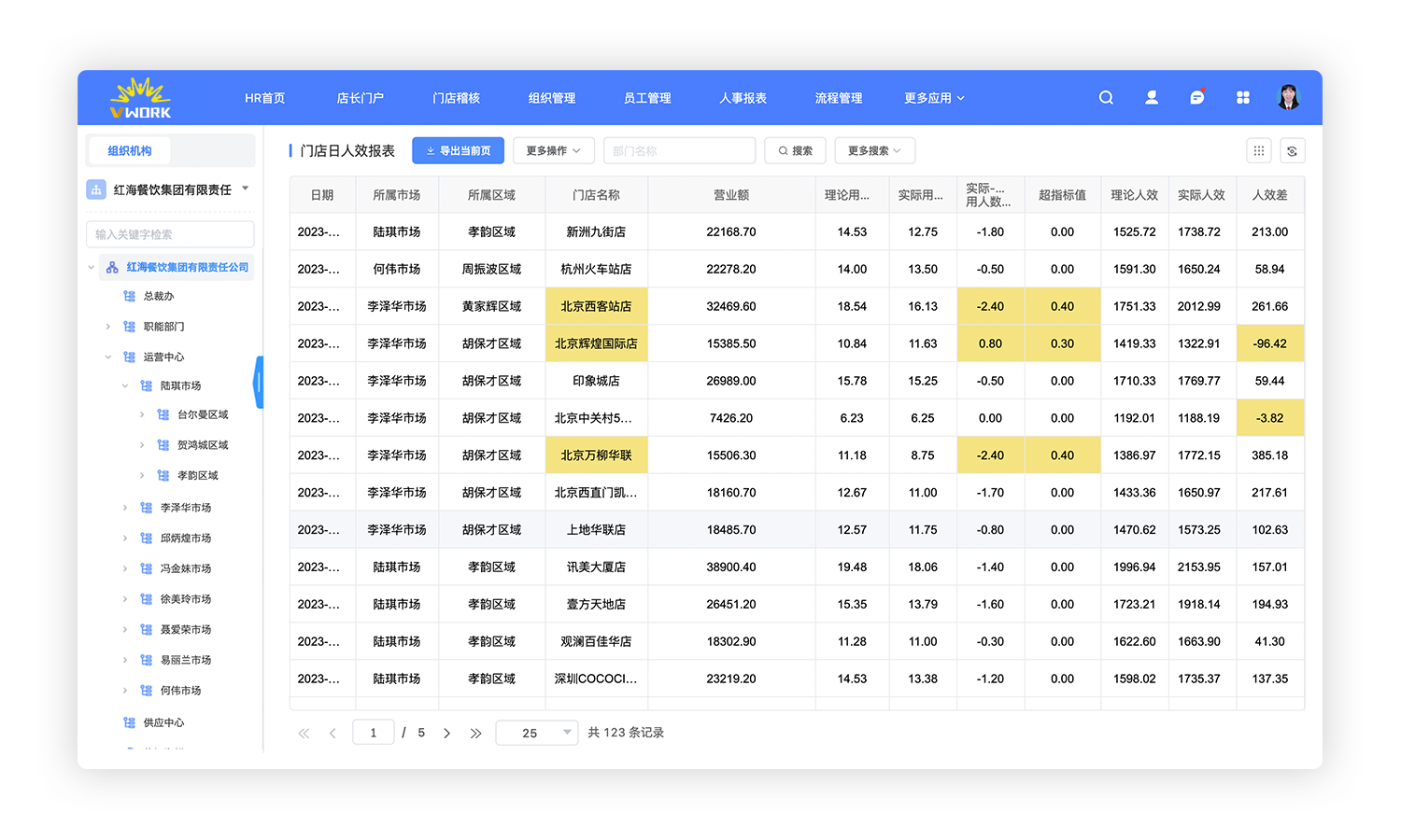 - 人效分析模型:预置丰富的人效分析指标和模型,系统自动跟踪并分析经营数据、排班数据、工时数据、理论用人与实际用人数据等。可视化数据看板直观呈现各门店人效分析,帮助管理层精准定位人效问题,快速制定优化决策,例如,某全国连锁餐饮品牌,通过红海云的人效分析,精准定位低效门店,在3个月内TOP10门店人效提升23%。
