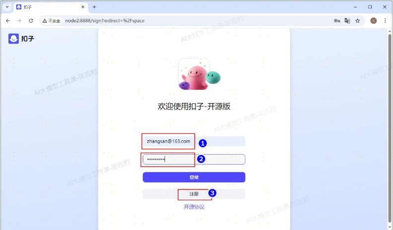 启动服务后,通过浏览器访问 http://ip:8888/ 即可打开 Coze Studio,输入邮箱和密码,首次点击注册后自动完成登录,后续登录可以输入邮箱和密码后直接点击“登录”。
