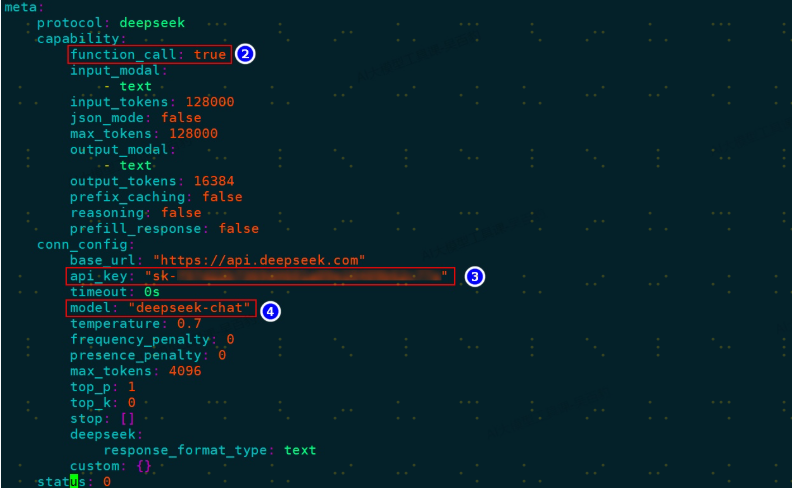 在 model_template_deepseek.yaml中配置id、meta.capability.function_call、meta.conn_config.api_key、meta.conn_config.model,三者解释如下: