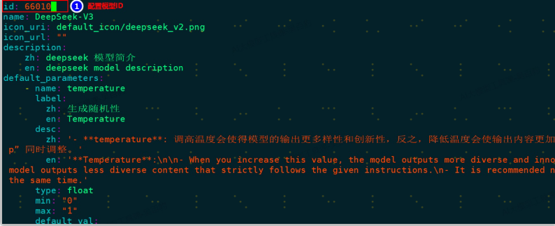 注意:所有模型服务的模板文件均位于 /backend/conf/model/template,你需要拷贝至 /backend/conf/model 后修改,重启服务后生效。model_template_deepseek.yaml配置内容如下: