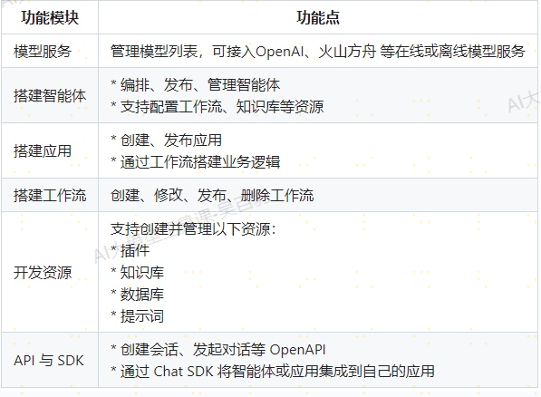 支持包括模型服务管理、智能体/应用构建、工作流设计、插件/知识库/数据库管理以及 API 与 Chat SDK 集成等。