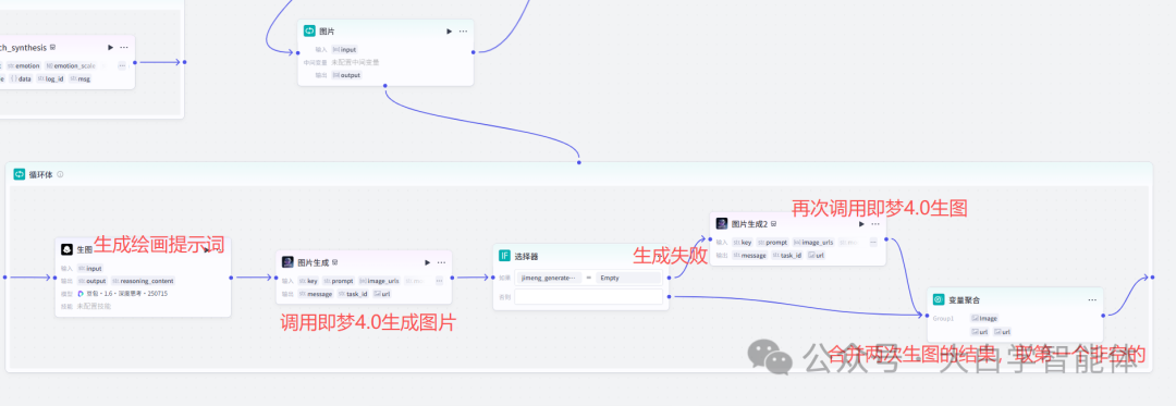 循环节点根据每一组文案,生成绘画提示词。接着调用即梦4.0生图插件生成图片。为了防止图片生成失败,这里采用了重试机制。