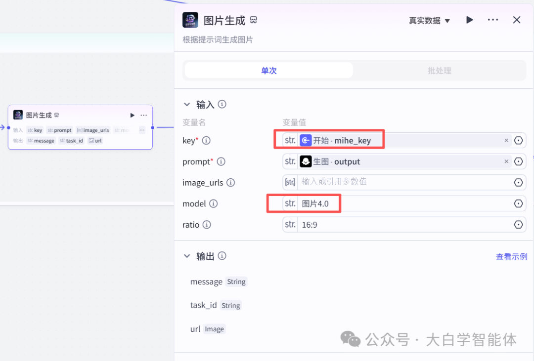 【即梦图片生成】插件如下配置,key填入开始节点的mihe_key,model选4.0,比例16:9, 横屏。