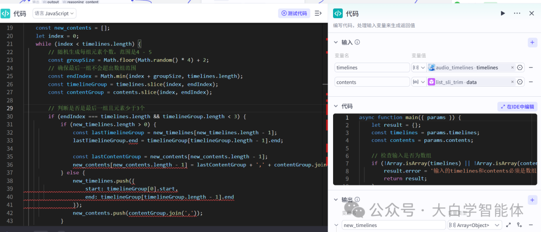 在代码节点里对文案进行拆分。每一组包含2-5个句子。