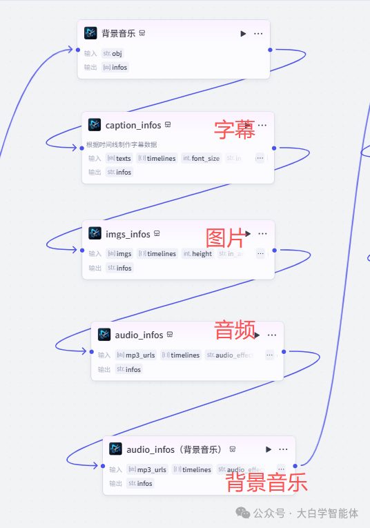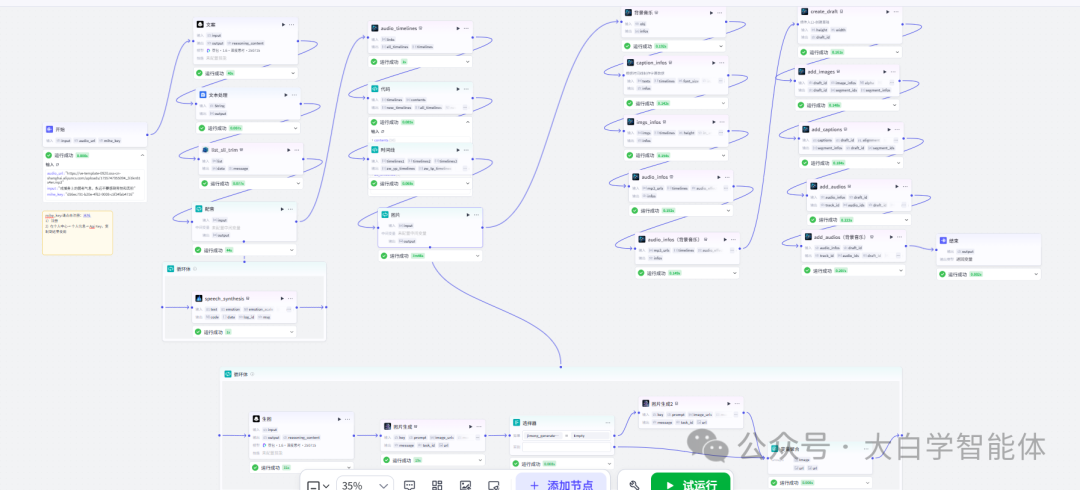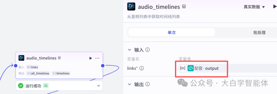 生成音频后,把循环节点返回的音频链接link,传给【剪映小助手】插件的audio_timelines方法,根据音频列表获取时间线。