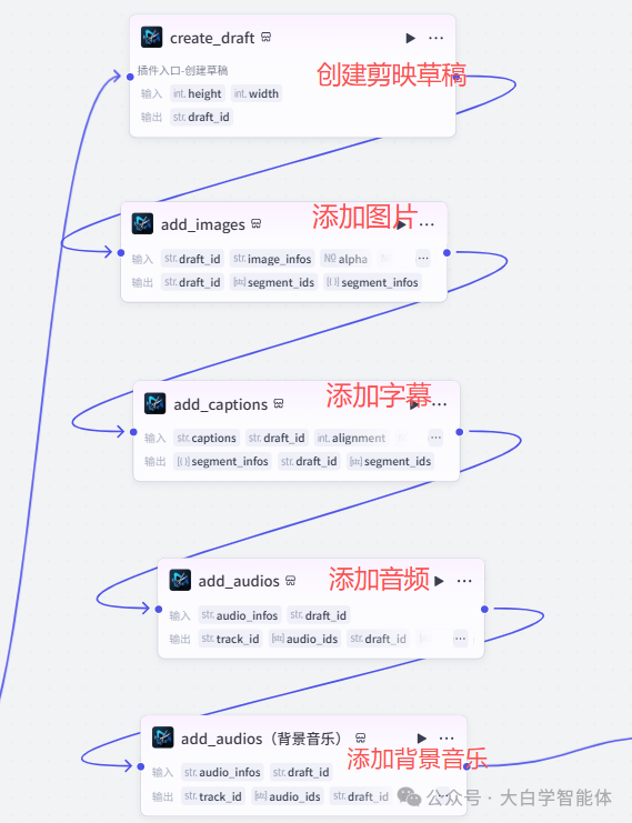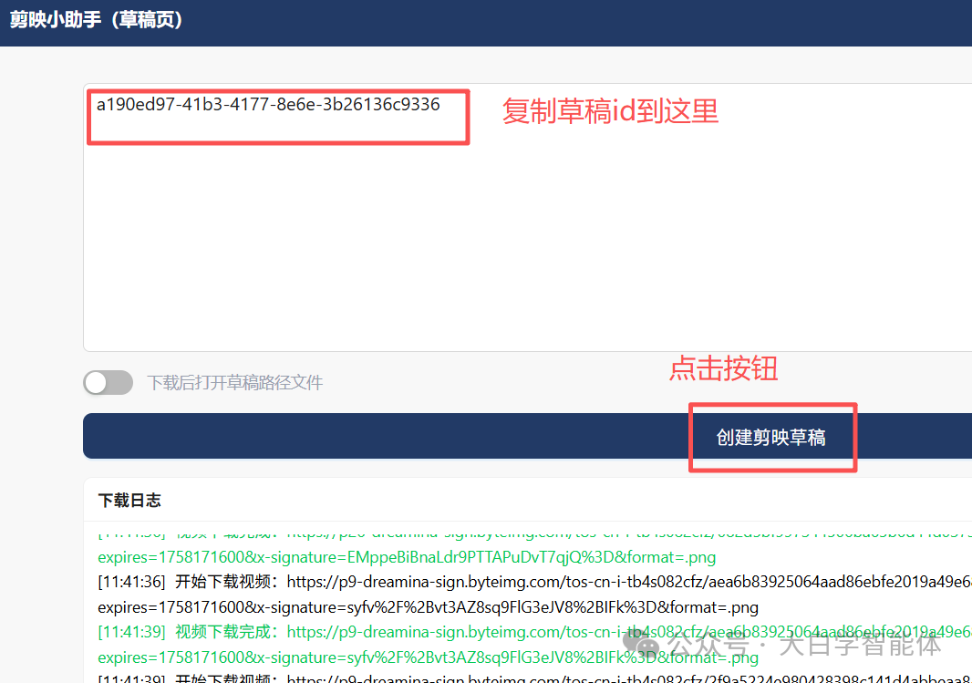 结束节点返回草稿地址,把这个草稿id复制到剪映小助手工具,点击创建剪映草稿。工具开始下载音频和视频文件。