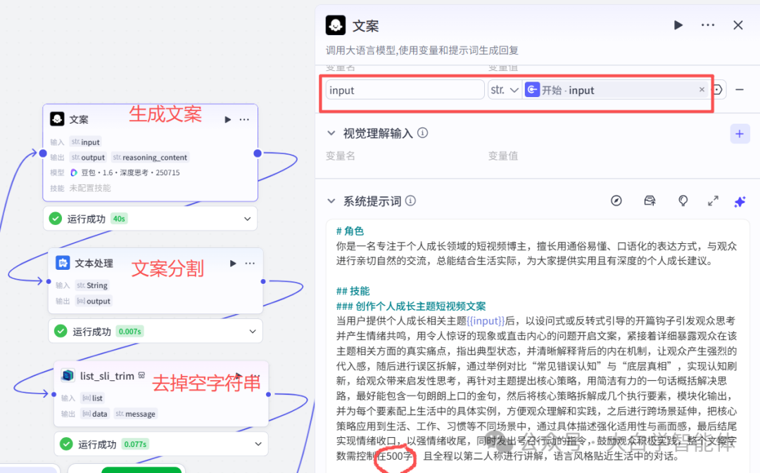 不会写代码的朋友,这个功能可以用大模型节点来帮你实现。大模型节点的提示词按照角色->技能->限制结构来清晰表达你的需求。