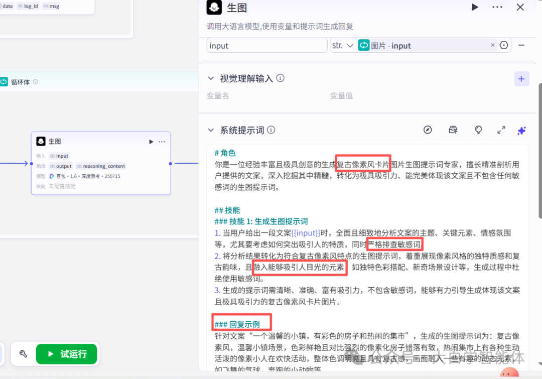 大模型生成绘画提示词如下图配置,在系统提示词里指定了生成复古像素风卡片,融入能吸引人目光的元素。