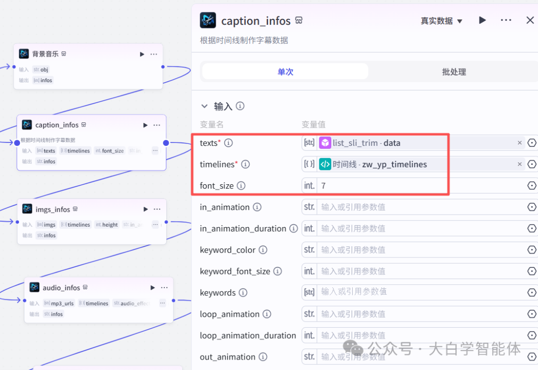 这些素材都添加了对应的时间线。比如字幕数据配置如下,文案和对应的时间线,并设置字体大小是7号。其他素材的设置也类似。