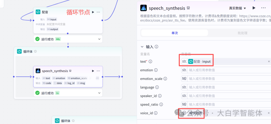 循环节点调用【语音合成】插件,依次生成文案音频。text选循环节点配音的每个文案,音色选【爽快思思】。