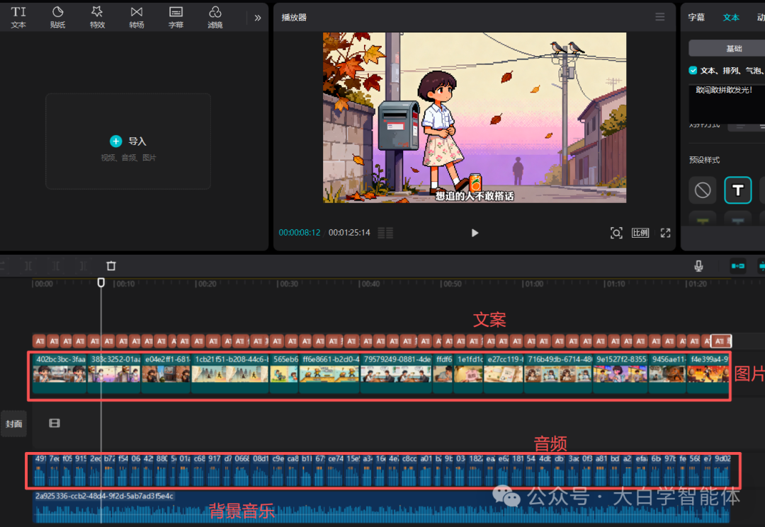 先来看下视频结构,都是比较常规的素材拼接,文案字幕+图片+音频+背景音乐。