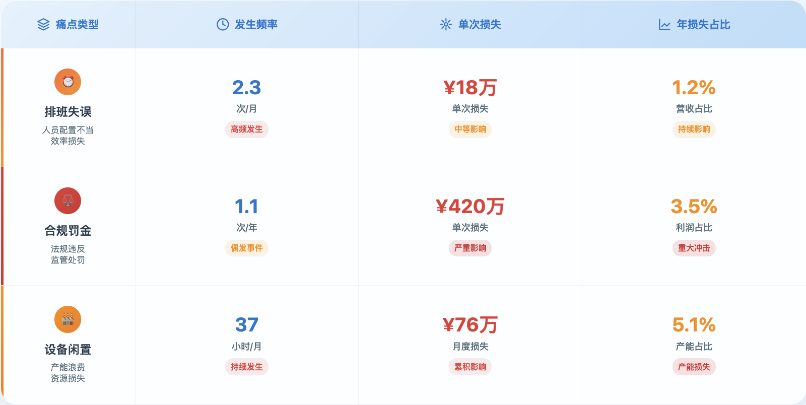 在实际运营中,HR部门不仅要应对“三班倒”排班的复杂性,还需处理因数据孤岛、流程断层和合规风险带来的连锁反应。例如,部分企业因跨厂区调度不及时,导致设备闲置时间每月高达37小时,直接造成数十万元的产能损失。与此同时,合规风险也在加剧——跨国法规和国内劳动法的双重压力下,企业每年因合规审查失误产生的罚金占利润比例高达3.5%。