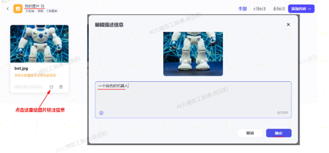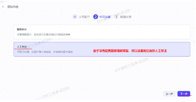 人工标注:根据图片内容,手动添加图片描述信息。如果选择人工标注,则需等待服务器处理完成后,单击图片手动添加标注信息。