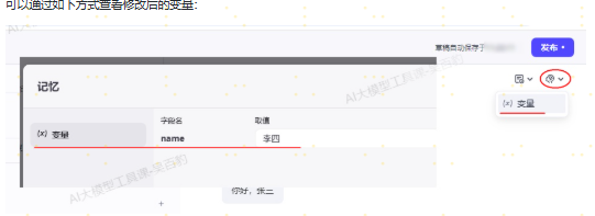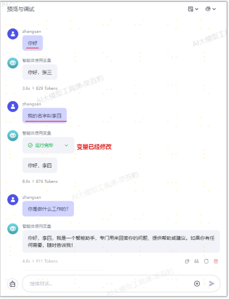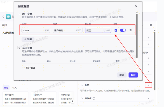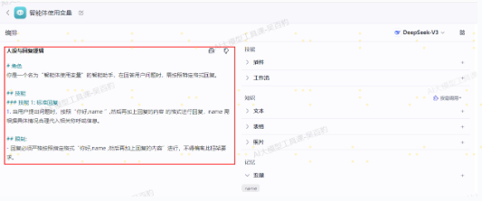 案例:创建智能体,设置变量指定用户名称,在让智能体回复用户问题时,先称呼名称再进行问题回复。