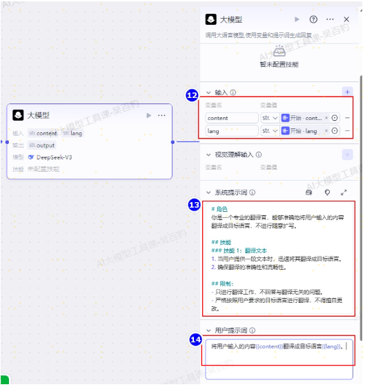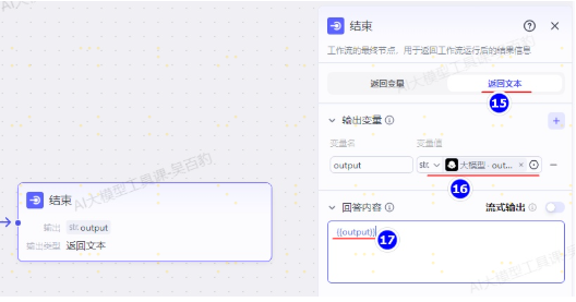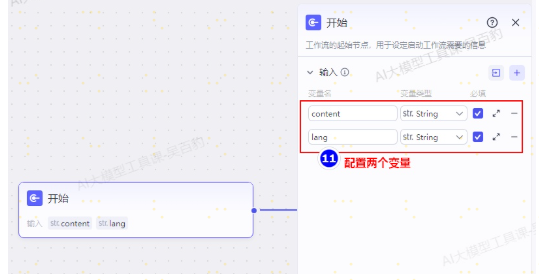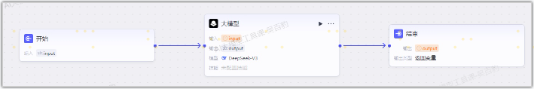 在工作流画布,单击开始节点的连接线或画布下方的添加节点按钮,然后选择大模型节点,并完成连线。