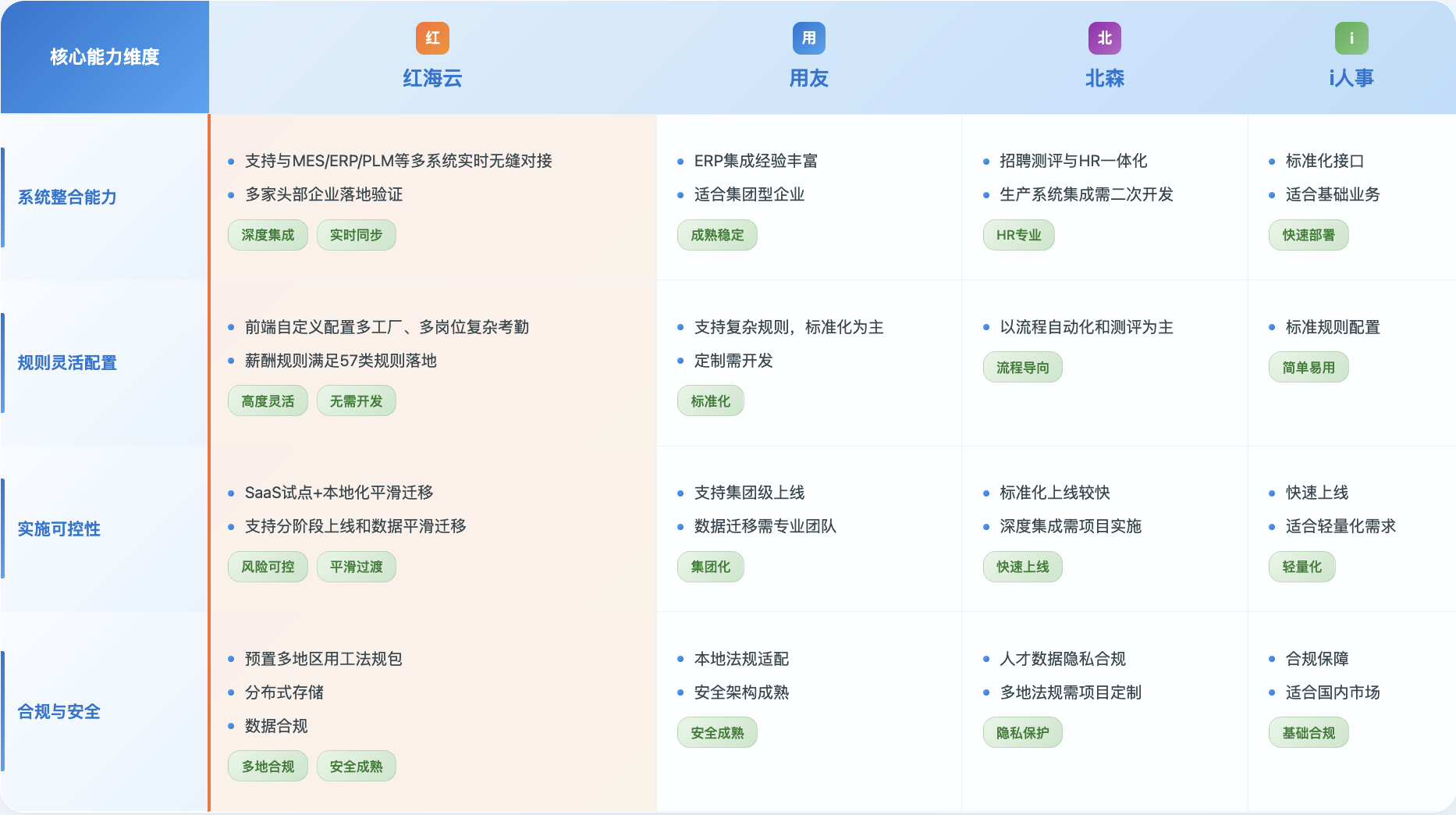 针对上述三大核心评估维度,当前市场主流的HR系统在功能覆盖、行业适配及落地能力方面各具特色。以下将以红海云、用友、北森、i人事等产品为代表进行多维度解析,帮助企业直观识别不同产品的业务价值。