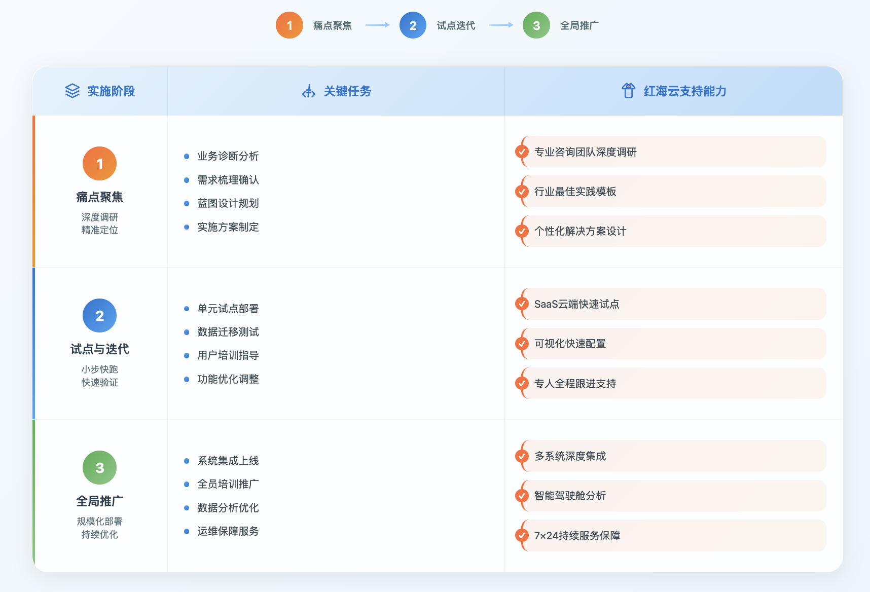 项目初期,建议企业组织多部门参与的需求调研,围绕技能断层、系统孤岛、合规风险等核心痛点,进行流程梳理与现状诊断。以红海云为例,项目专家直接参与方案设计,通过多轮访谈和现场调研,形成详细的业务现状报告,并与企业共同制定定制化的系统落地蓝图。这一阶段也是明确系统边界、分阶段上线策略的关键。
