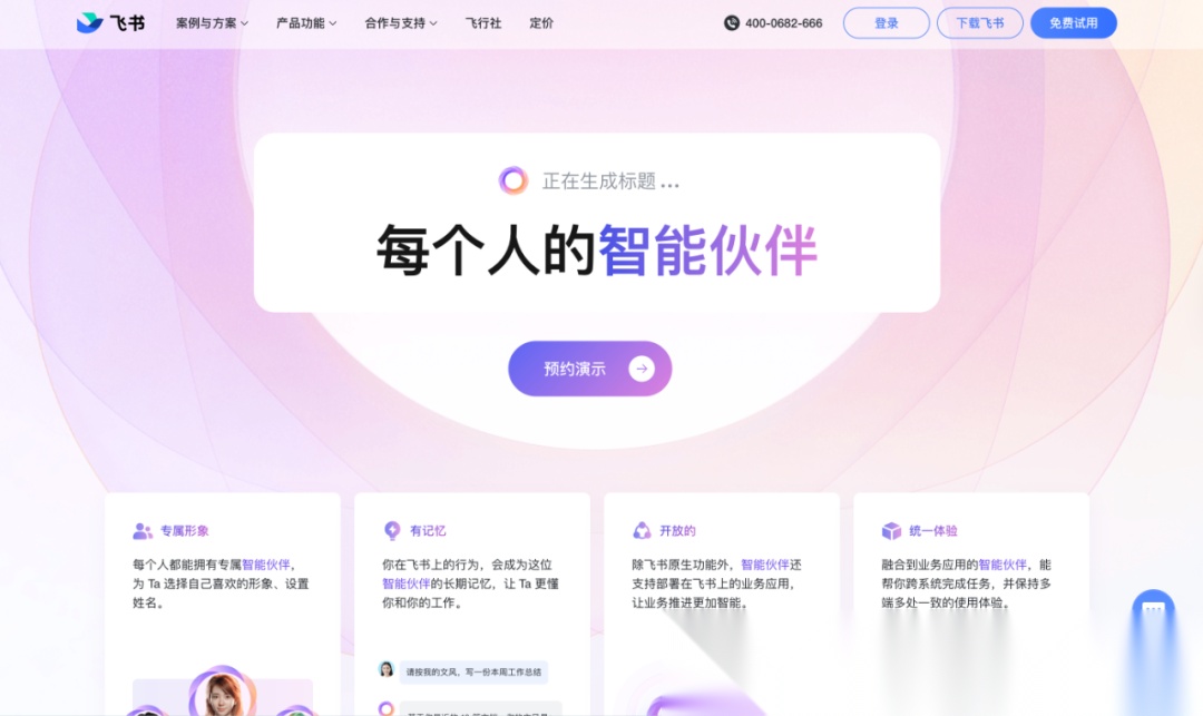 一句话介绍:深度集成飞书生态的办公智能助手,支持会议纪要、文档创作与流程自动化。