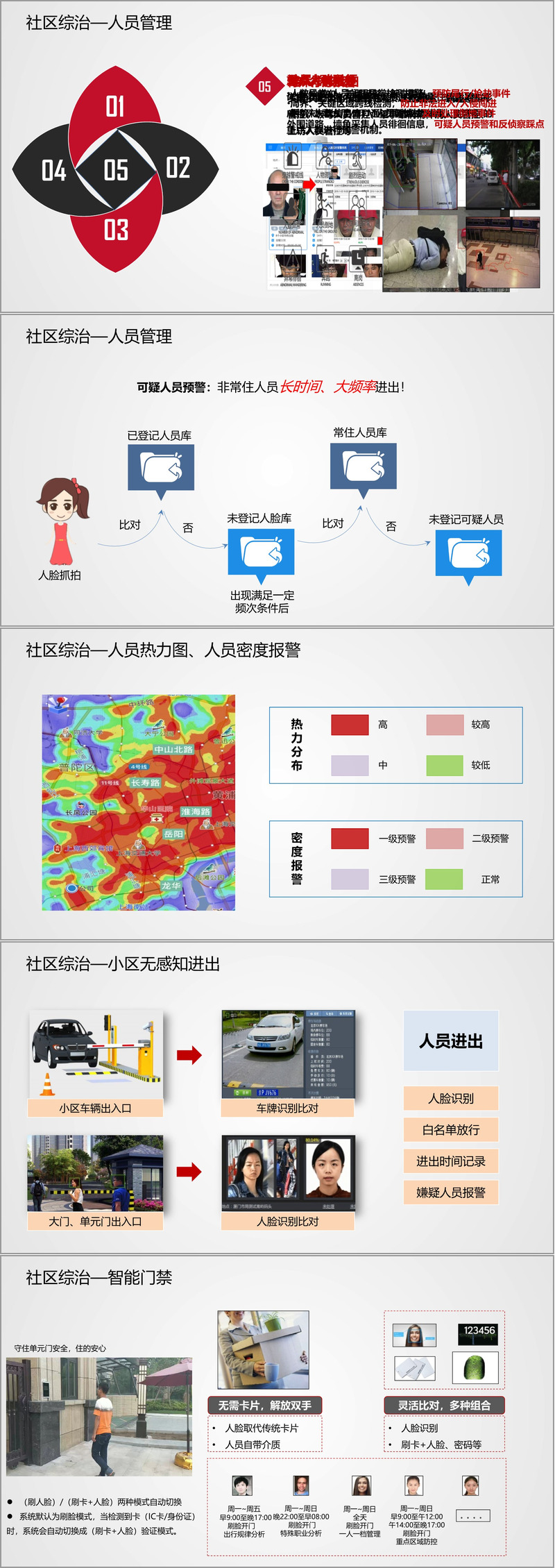 智慧综治充分整合资源,将海康威视与有线网络能力融合,通过感知层、解析层、传播层和链路层实现社区综治。社区设置多层防线,从社区外围到小区出入口、公共区域、单元楼,进行逐层防控。在人员管理与服务上,关注独居老人关怀、重点人员管控、特殊人群服务等,对可疑人员预警,对人员密度进行监测报警。小区进出管理实现无感知进出,对人员和车辆精准识别管控,智能门禁支持多种模式,提升通行效率与安全性。