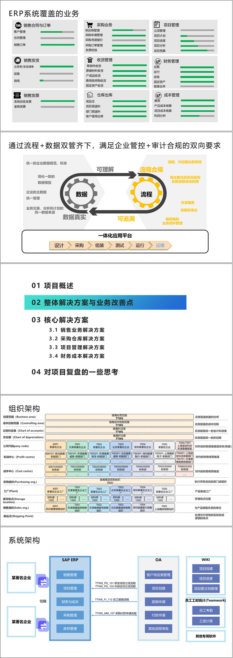 核心解决方案细分了销售、采购仓库、项目管理、财务成本四个模块。销售模块明确组织架构、流程总览及针对不同业务的核心方案;采购仓库模块涵盖组织架构、业务和流程总览,以及与 OA 系统集成、采购流程等核心方案;项目管理模块介绍组织架构、流程和业务概览,还有项目业务范围划分等核心方案;财务成本模块包含流程和组织架构,以及主数据方案、各类集成和核算方案等核心内容。