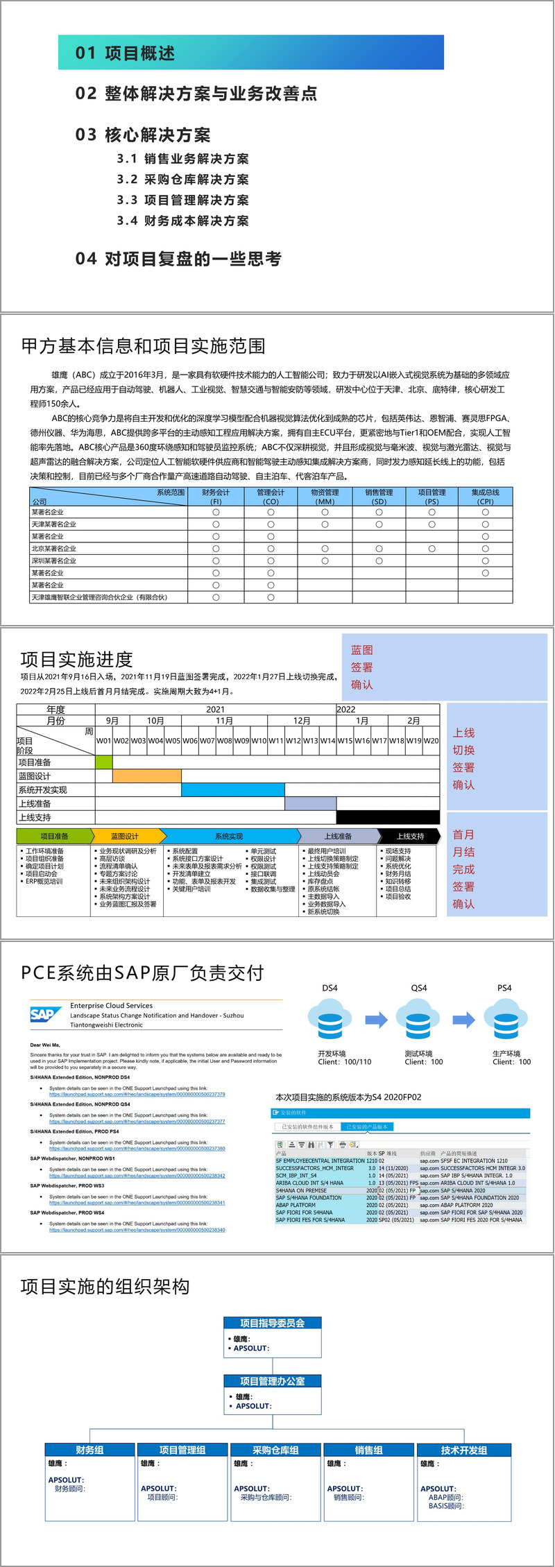 项目概述部分,介绍了参与项目的多家企业在财务会计、管理会计等系统范围的覆盖情况,雄鹰(ABC)作为人工智能公司的基本信息、核心竞争力及业务范围也被提及。项目实施进度明确,从入场到上线后首月月结完成周期约为 4+1 月,还说明了系统由 SAP 原厂交付及相关测试、开发、生产环境,项目实施的组织架构包含指导委员会、管理办公室及多个业务小组,ERP 系统覆盖销售、采购、财务等多类业务。