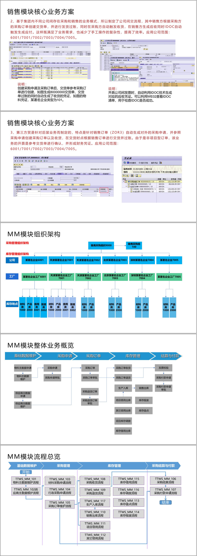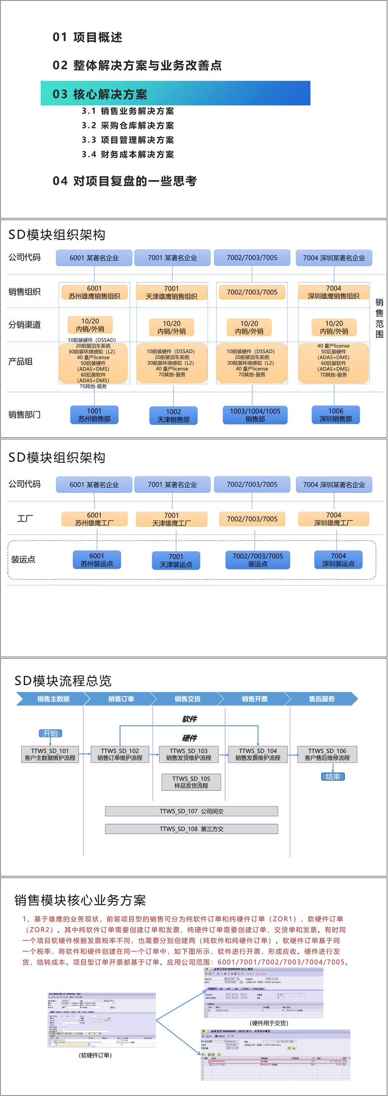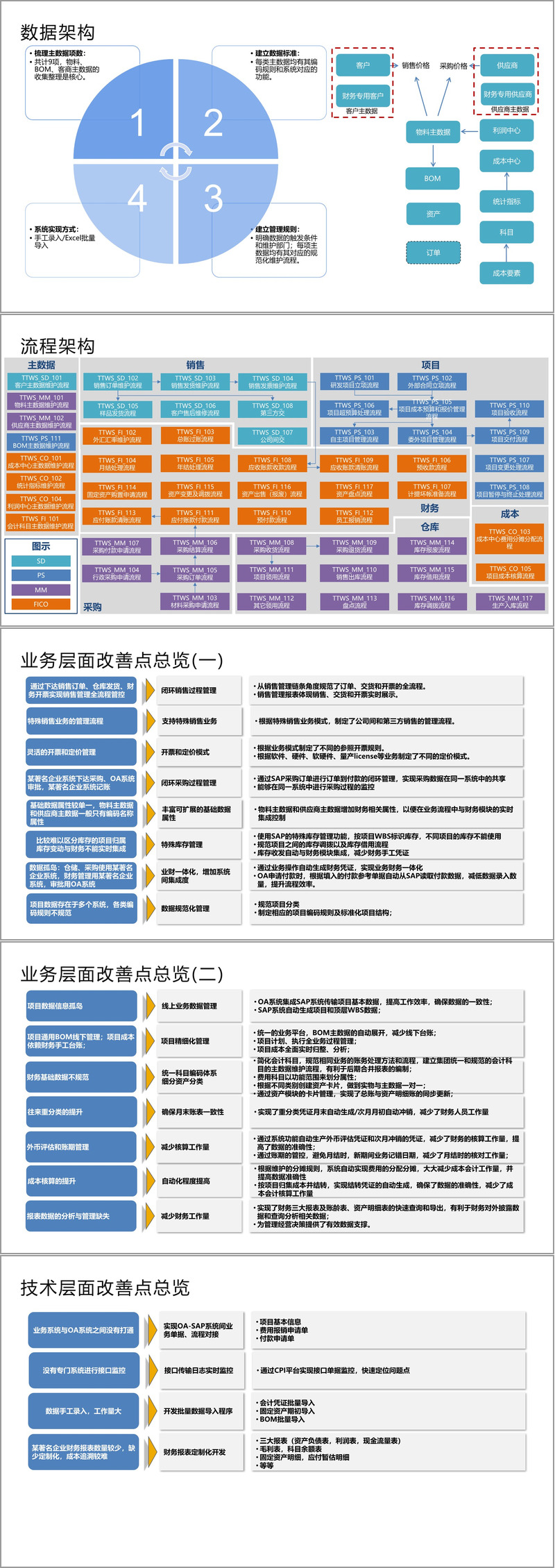 整体解决方案与业务改善点方面,从业务和技术层面阐述。业务上实现了销售、采购过程的闭环管理,规范了数据和项目管理,促进业财一体化等;技术上实现了系统间对接、开发批量数据导入程序等。