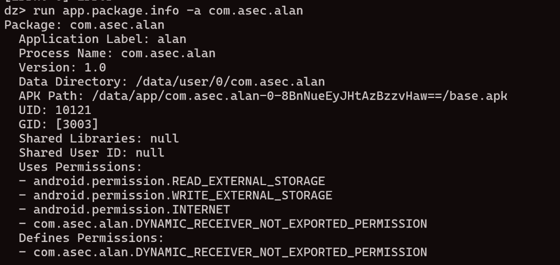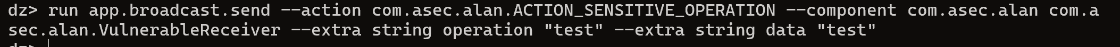 run app.broadcast.send --action com.asec.alan.ACTION_SENSITIVE_OPERATION --component com.asec.alan com.asec.alan.VulnerableReceiver --extra string operation "test" --extra string data "test"