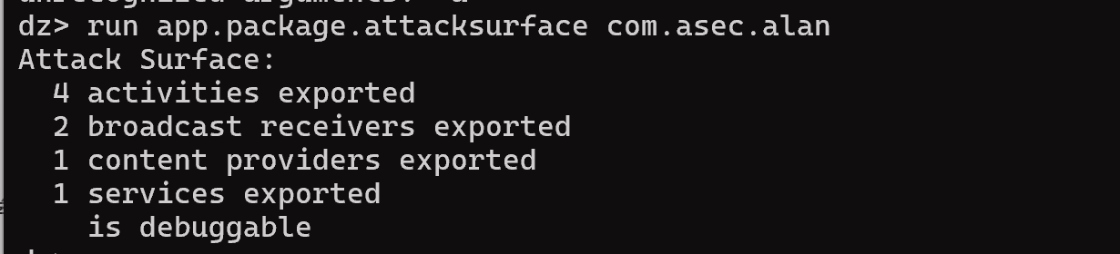 利用app.package.attacksurface可以查询该APP的攻击面,即漏洞的点和数量。