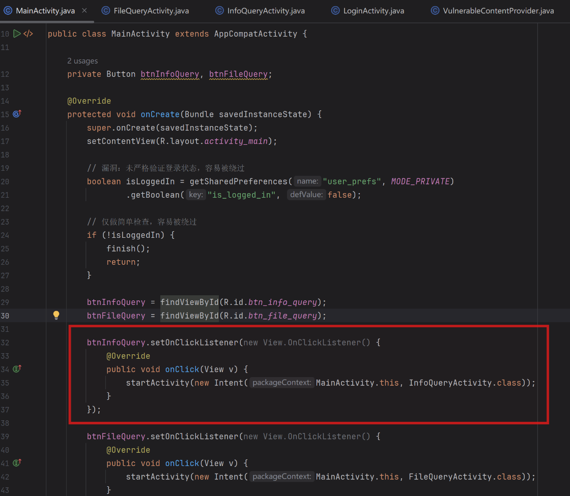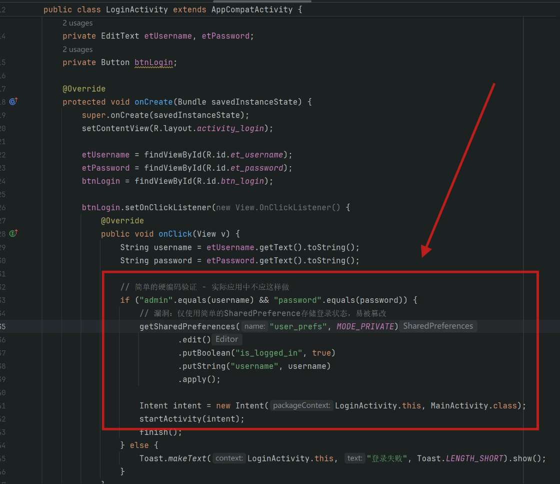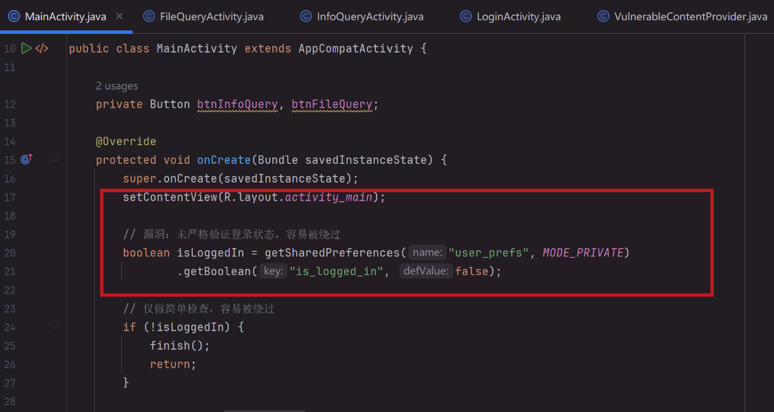 以下为具体的代码,以LoginActivity登录->MainActivity->InfoQueryActivity场景为例,可以看到首先LoginActivity以硬编码的形式进行用户密码的判断,并使用SharePreference进行了登录态的存储