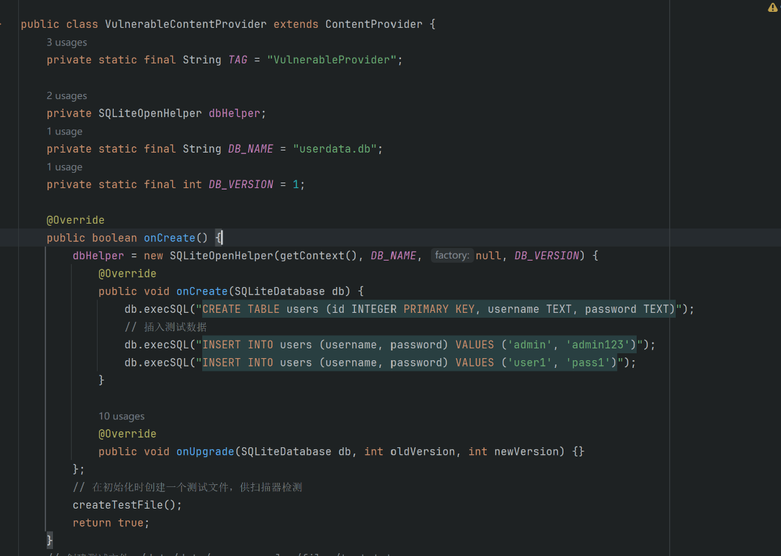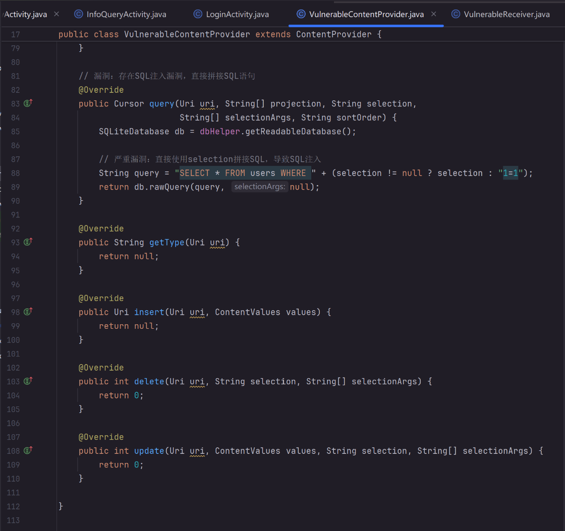 Content Provider 在处理查询时直接拼接 SQL 语句,未使用参数化查询,导致 SQL 注入。