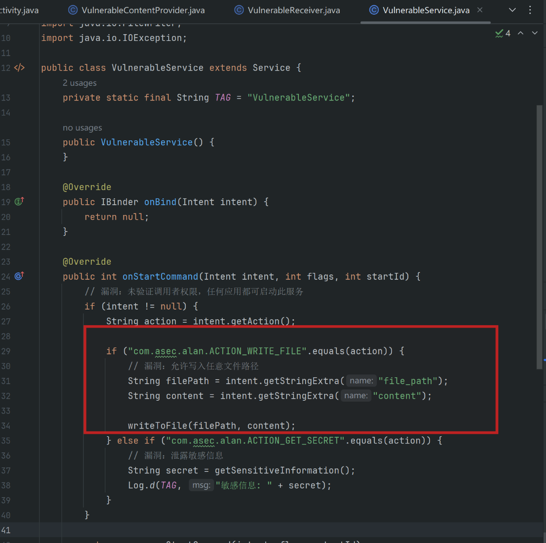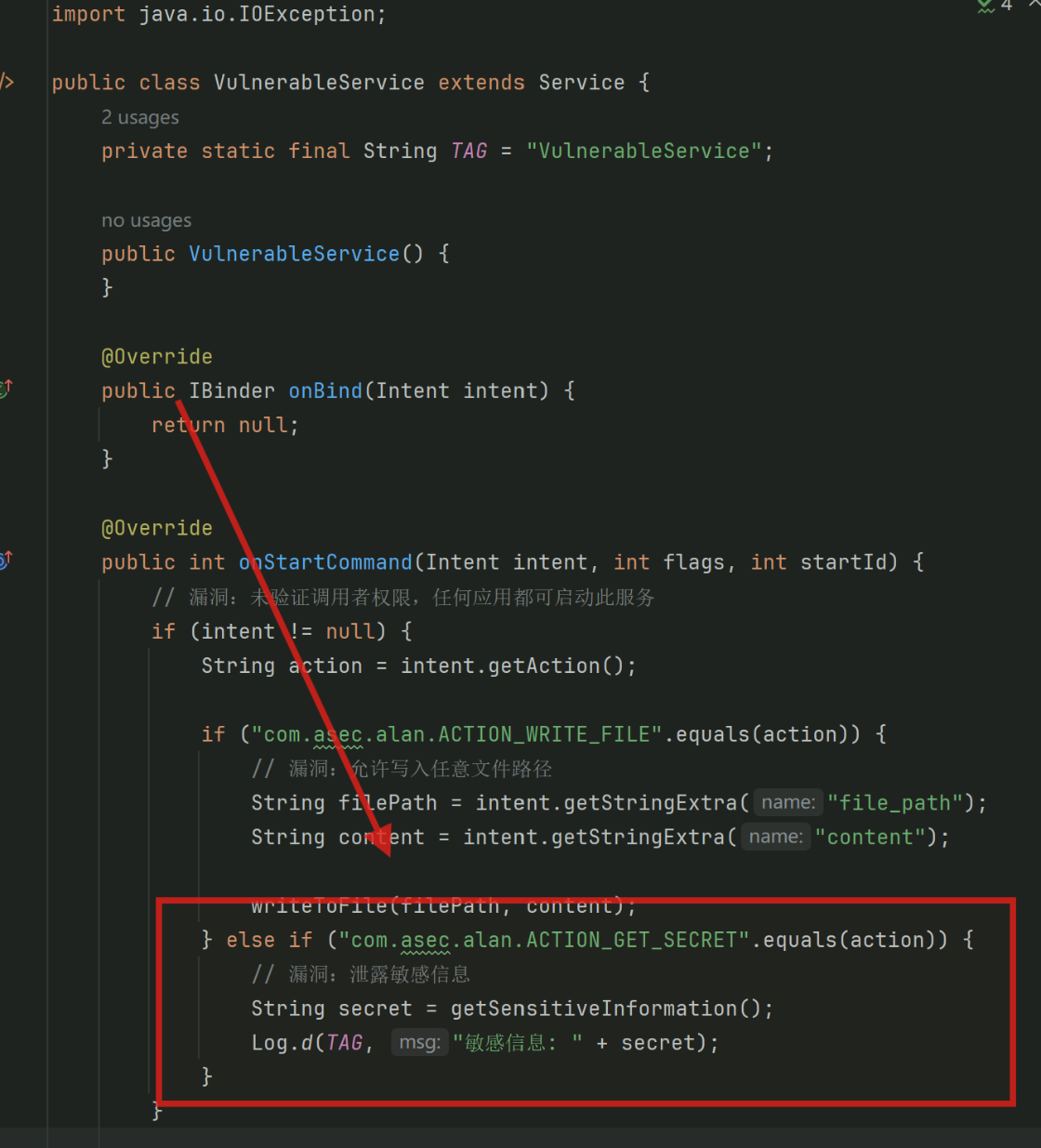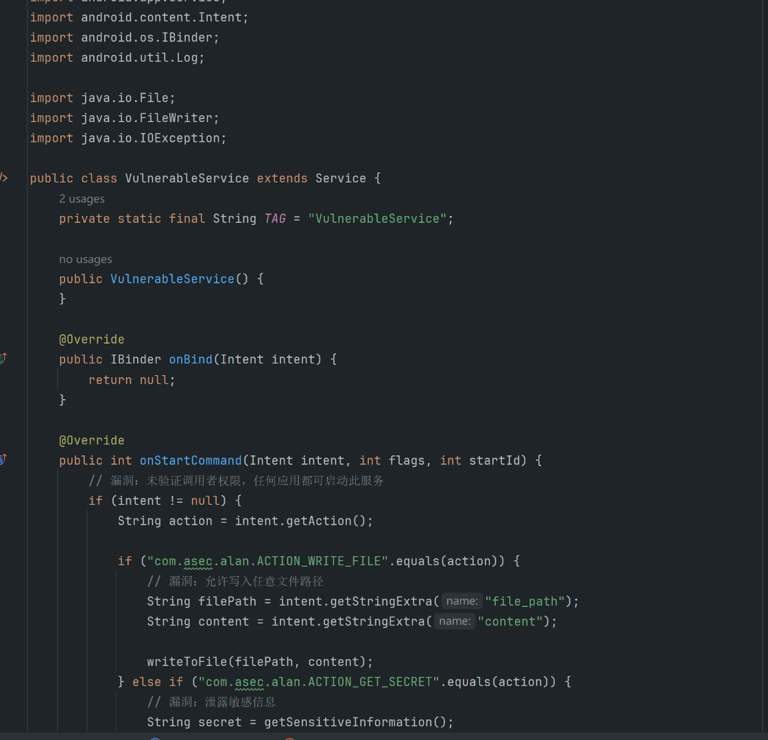 当 Service 处理"com.asec.alan.ACTION_WRITE_FILE"动作时,会从 Intent 中直接读取filePath参数及需要写入的内容,并通过writeToFile()方法写入内容。但是writeToFile()直接使用传入的filePath创建File对象,未检查路径是否限制在应用私有目录
