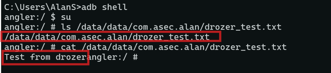 通过drozer命令向/data/data/com.asec.alan/写入drozer_test.txt文件,文件内容为Test from drozer