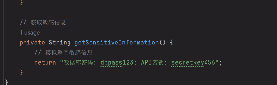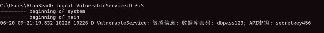 当 Service 处理"com.asec.alan.ACTION_GET_SECRET"动作时,getSensitiveInformation()方法会返回包含数据库密码、API 密钥等核心敏感数据,并通过Log.d()输出到系统日志