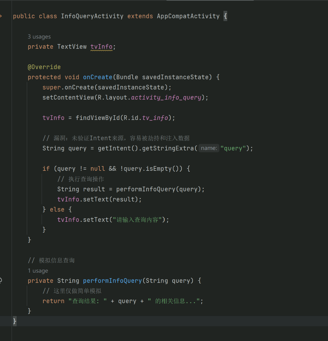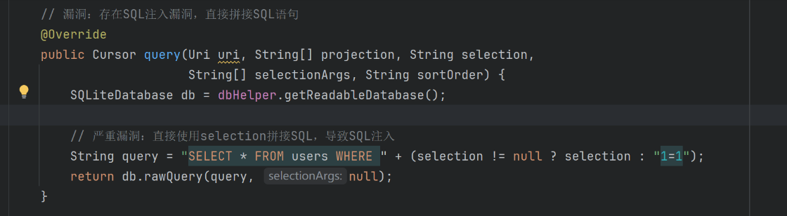 通过代码发现将selection参数直接拼接进 SQL 查询字符串,未使⽤参数化查询或输⼊净化,完全信任外部输⼊。并且忽略了selectionArgs参数,该参数本应⽤于安全传递查询参数,调⽤rawQuery时未使⽤参数绑定功能,⽽是传递null。