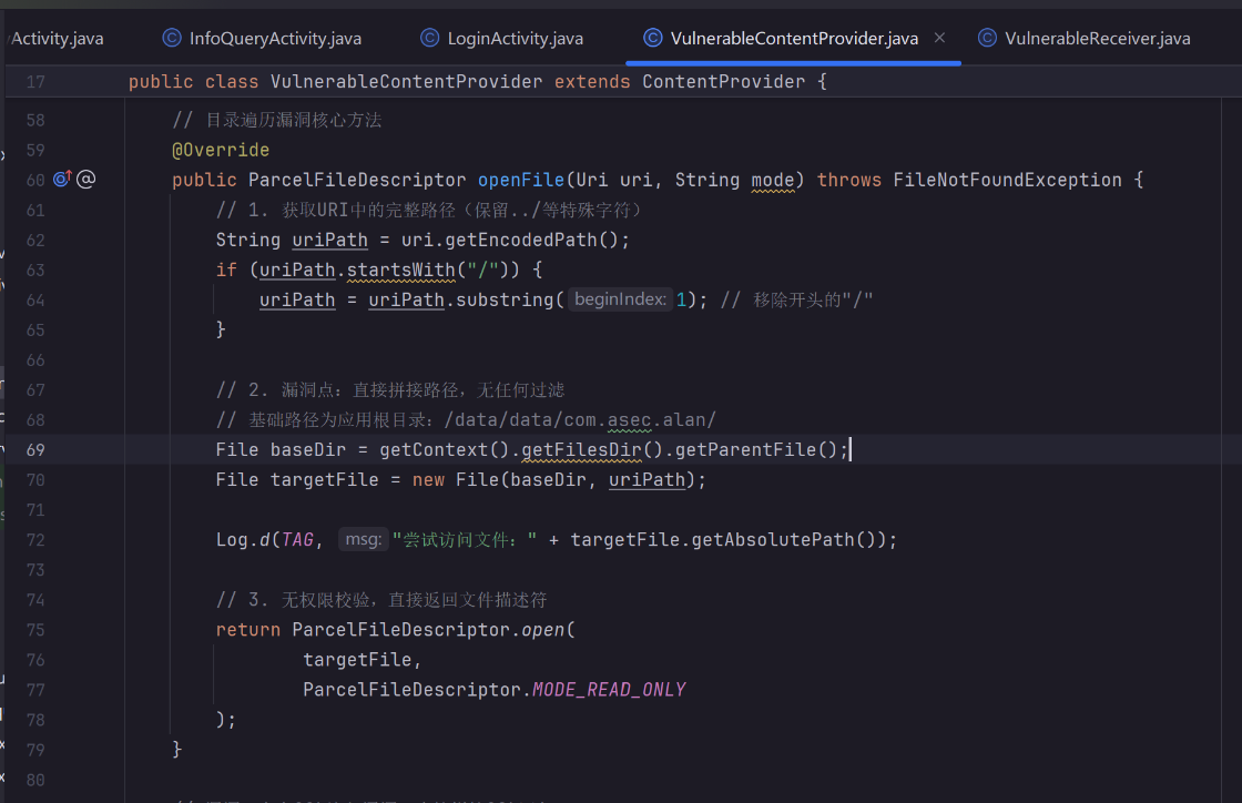 Content Provider 的openFile()方法未验证文件路径,导致攻击者可访问应用沙盒外的任意文件。