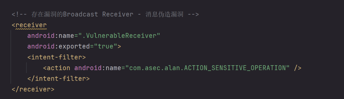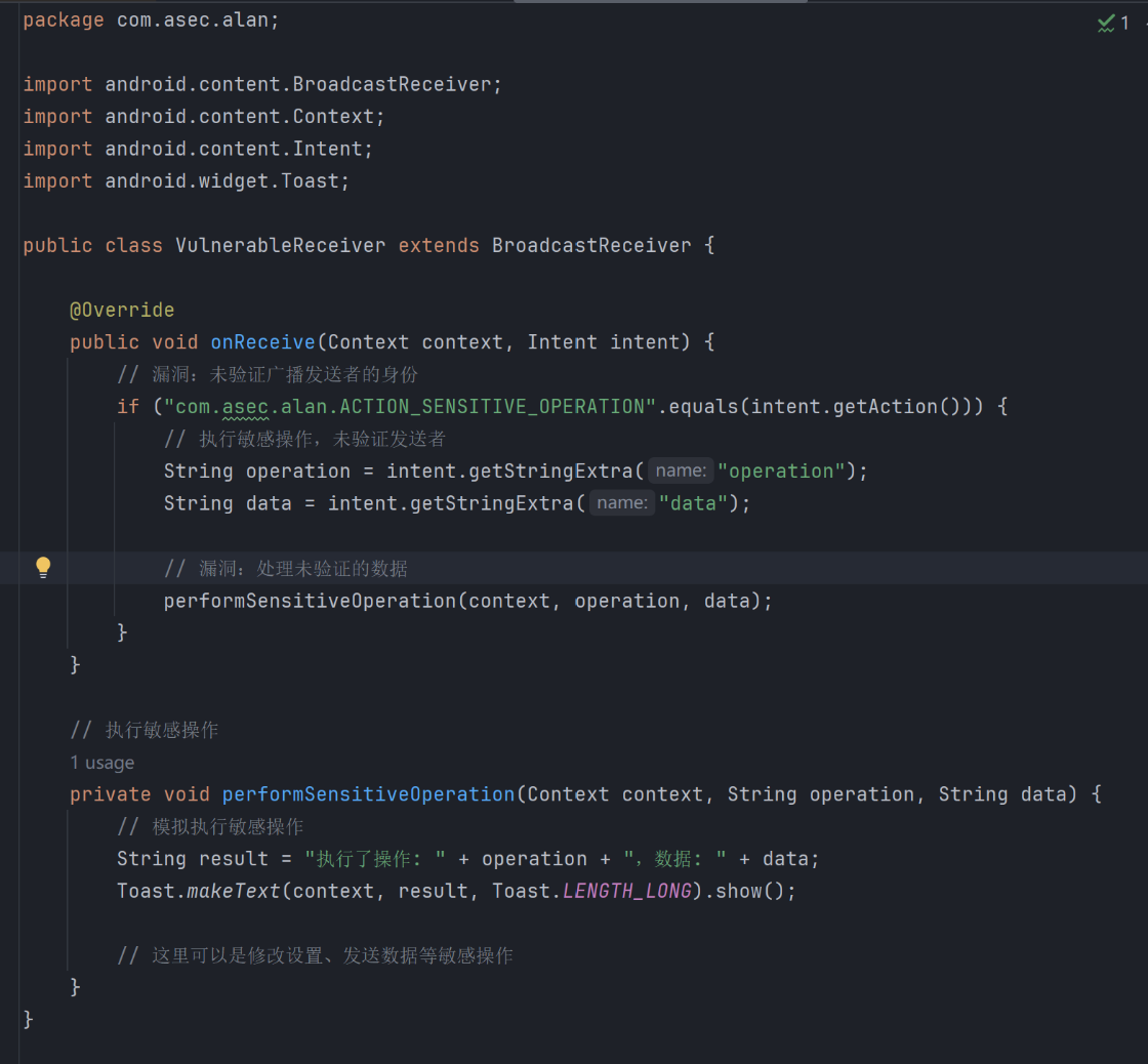 该接收器未对广播发送者的身份进行任何验证,任何应用都可以发送com.asec.alan.ACTION_SENSITIVE_OPERATION动作的广播来触发其逻辑。并通过performSensitiveOperation方法执行敏感操作,测试使用Toast在界面弹窗展示,但整个调用链都没有权限检查机制。