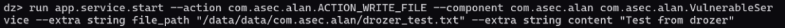run app.service.start --action com.asec.alan.ACTION_WRITE_FILE --component com.asec.alan com.asec.alan.VulnerableService --extra string file_path "/data/data/com.asec.alan/drozer_test.txt" --extra string content "Test from drozer"